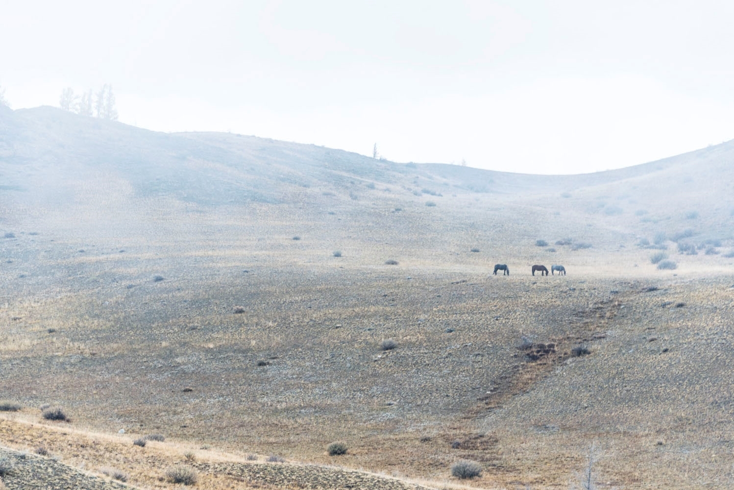 Табуны лошадей пасутся на вольном выпасе. Чужих к себе не подпускают — стоит приблизиться, как вожак тотчас уводит табун.